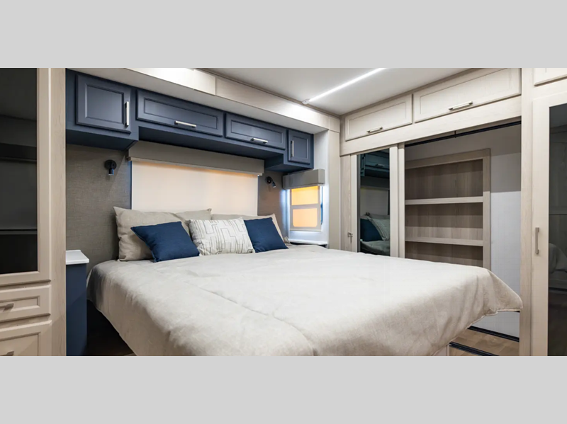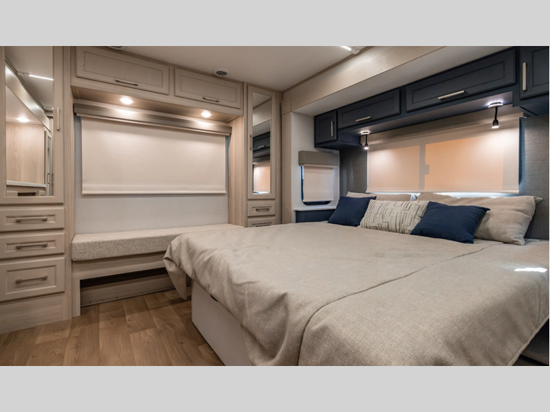 There is a 6-point hydraulic leveling system that will have you set up at camp in no-time, and the slam latches on all storage doors will make it easy to unload your gear. A heated utility convenience center is also found outside, along with a tire pressure monitoring system, a ladder, and slide toppers. Inside, you'll be met with upgraded true solid surface countertops in the bath and kitchen, dimmable ceiling strip lighting, hybrid marine-grade carpet, plus roller day/night shades in the main areas to name a few comforts.