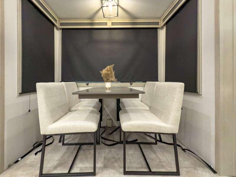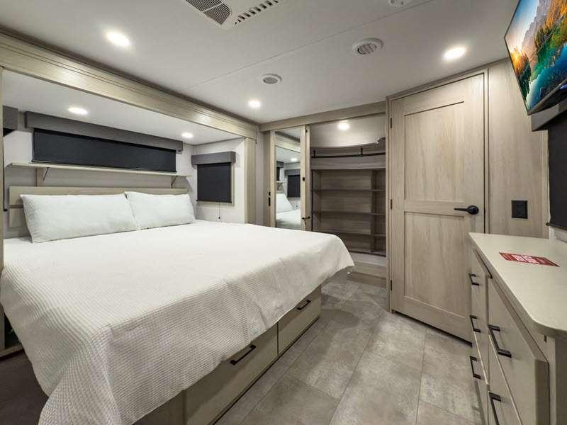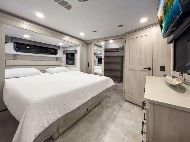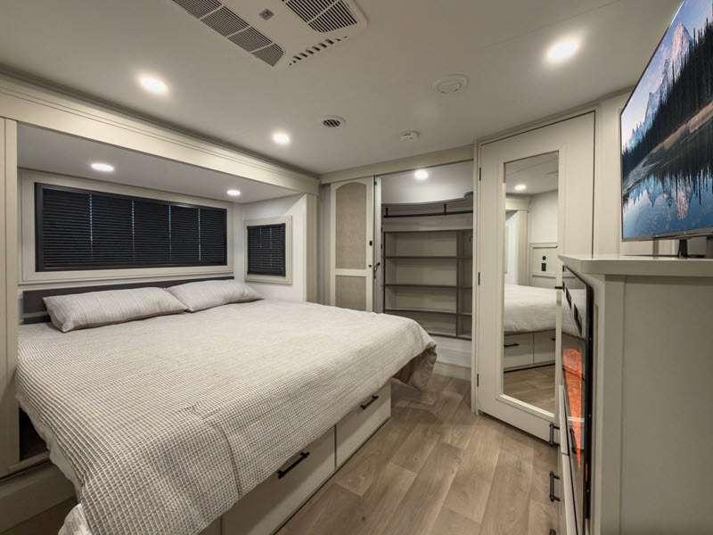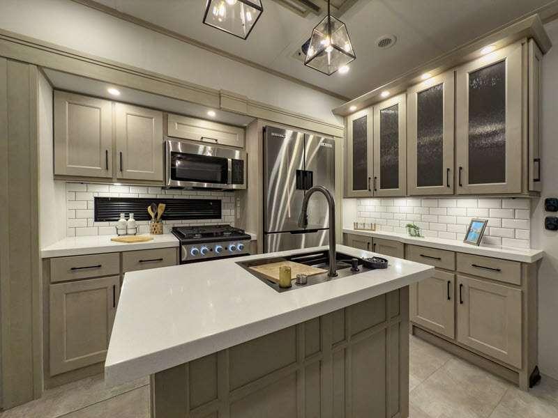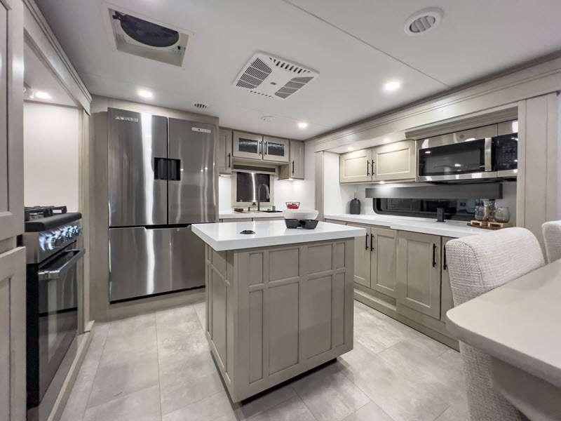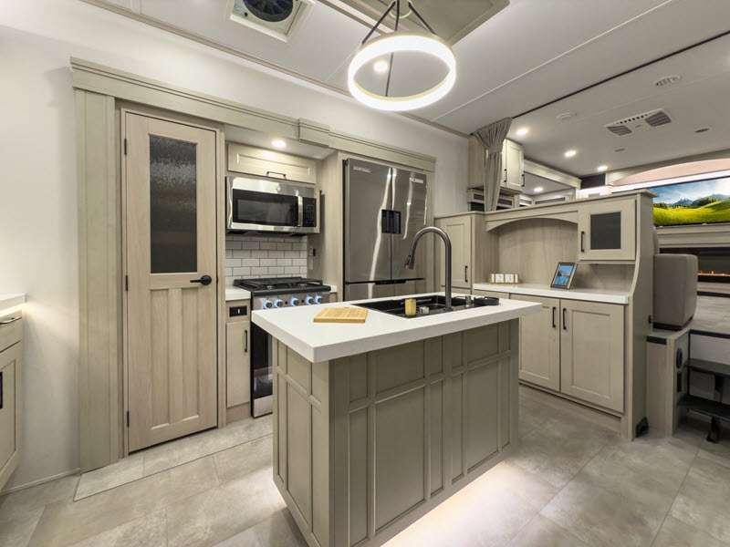 Each is built on a 101" wide body drop-frame super chassis, and includes the MORryde pin box system that utilizes a unique rubber shear spring to positively deal with rough towing and road shock. Some standard features that stand out include the chef-inspired professional grade stainless steel cooktop and Smart sink with a removeable cutting board, produce strainer and glass rinser, and the on-demand water heater with a whole house water filtration system. There is also an all-in-one enclosed and heated utility center to enjoy four seasons of camping, plus many more comforts.